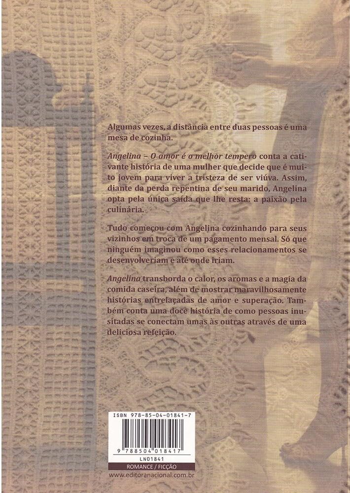 Angelina O amor é o melhor tempero conta a cativante história de uma mulher que decide que é muito jovem para viver a tristeza de ser viúva. Assim, diante da perdarepentina de seu marido, Angelina opta pela única saída que lhe resta: a paixão pela culinária.Tudo começou com Angelina cozinhando para seus vizinhos em troca de um pagamento mensal. Só que ninguém imaginou como esses relacionamentos se desenvolveriam eaté onde iriam.Angelina transborda o calor, os aromas e a magia da comida caseira, além de mostrar maravilhosamente histórias entrelaçadas de amor e superação. Também conta uma doce história de como pessoas inusitadas se conectam umas às outras através de uma deliciosa refeição.